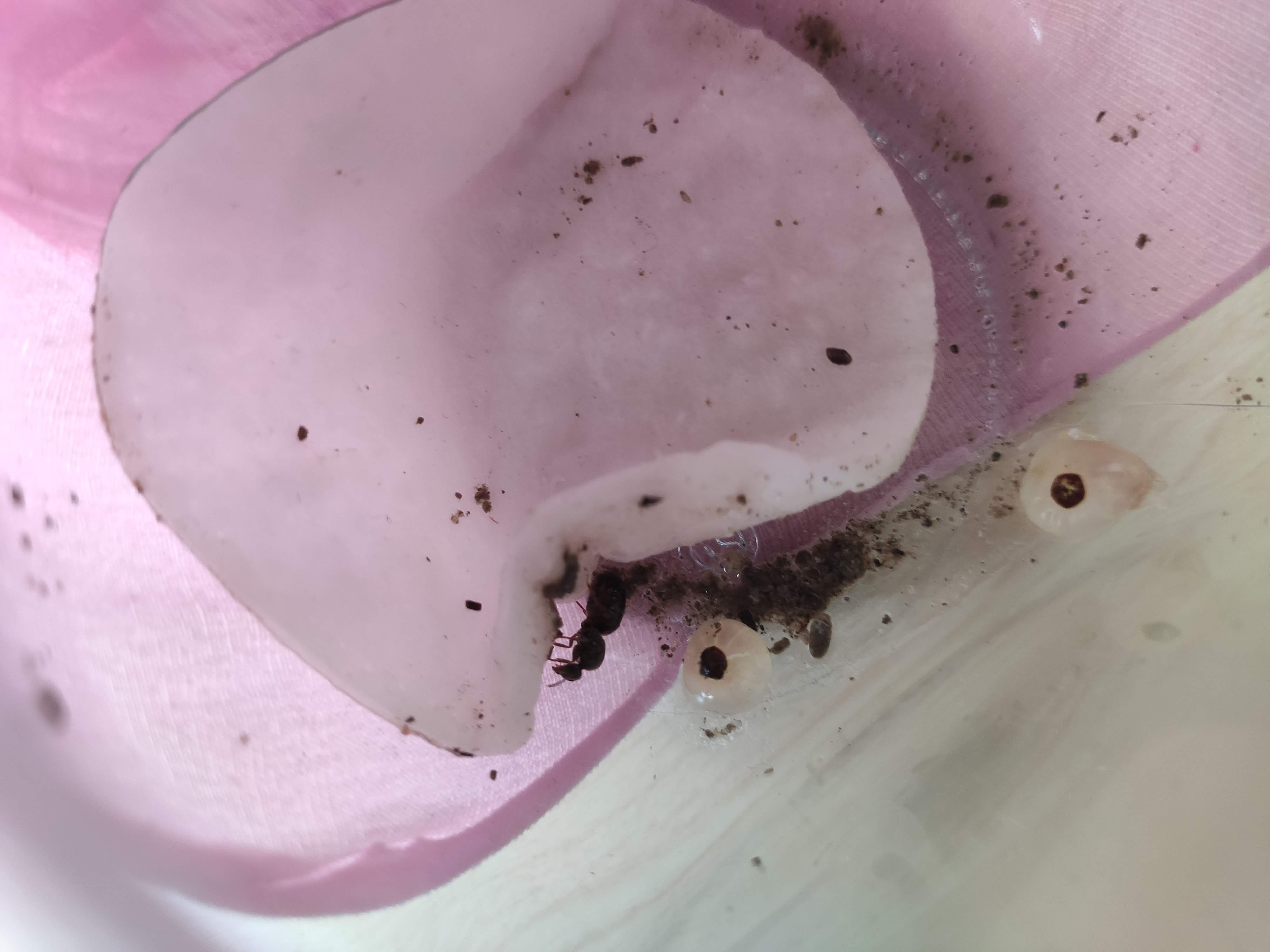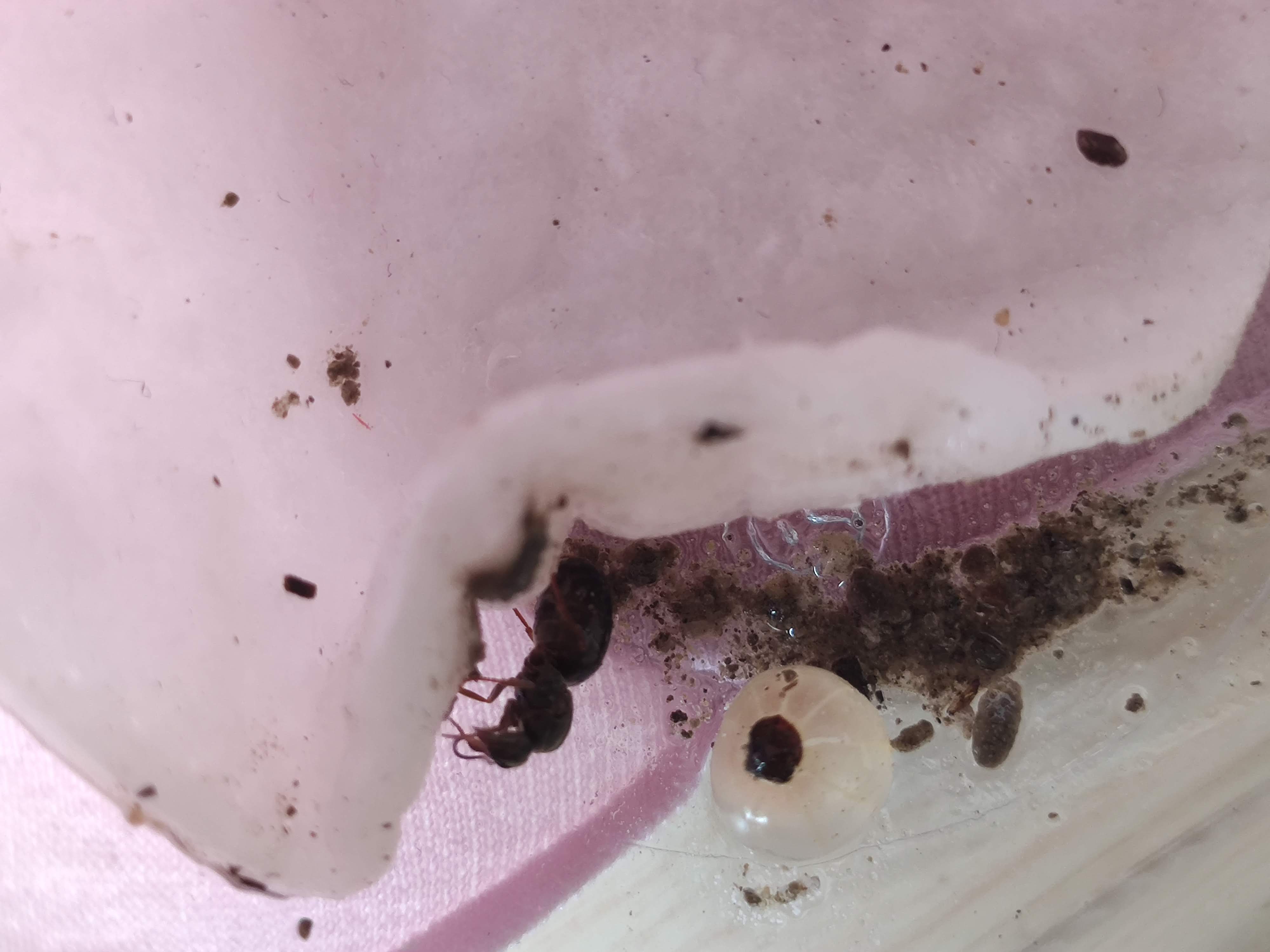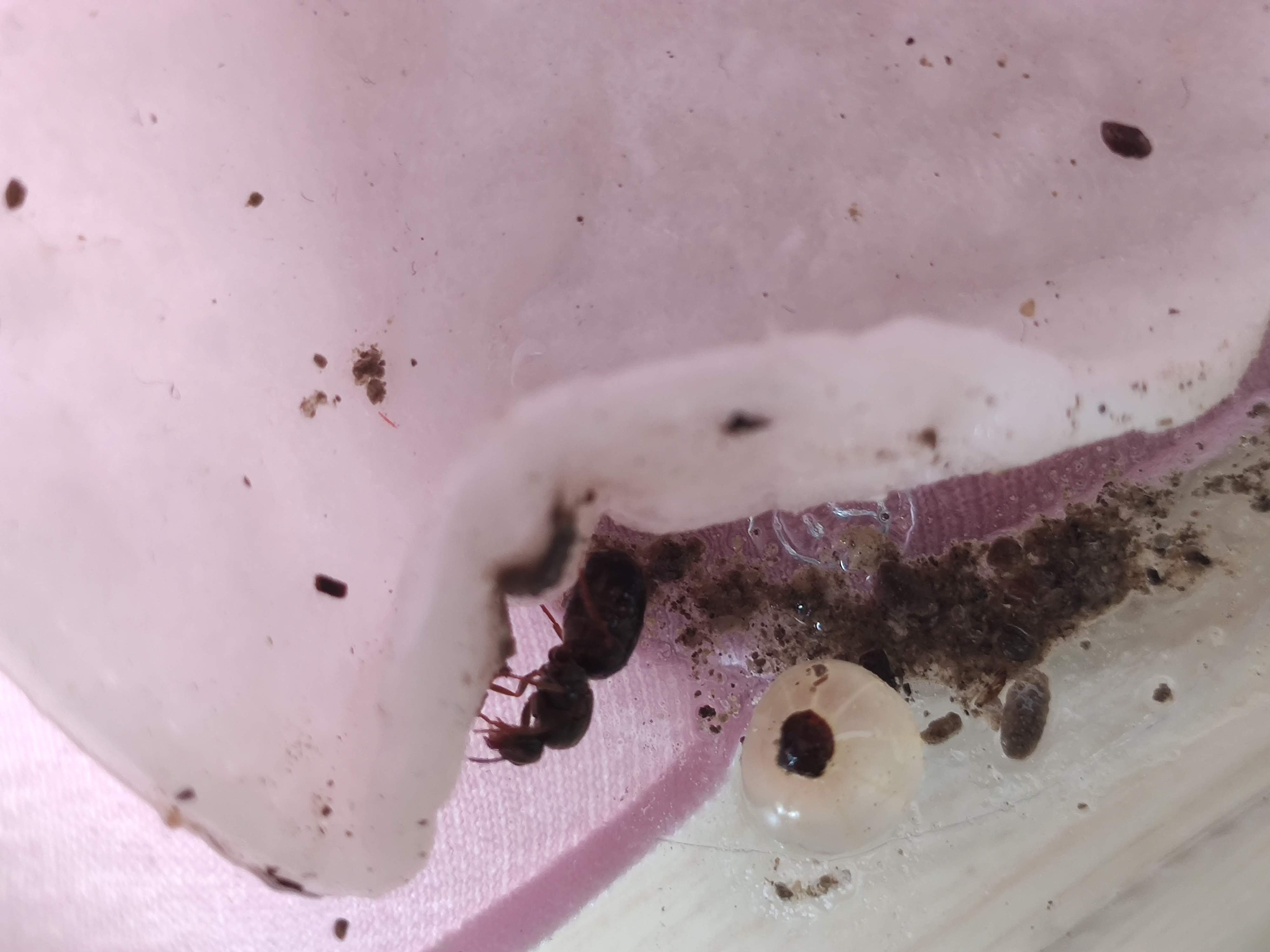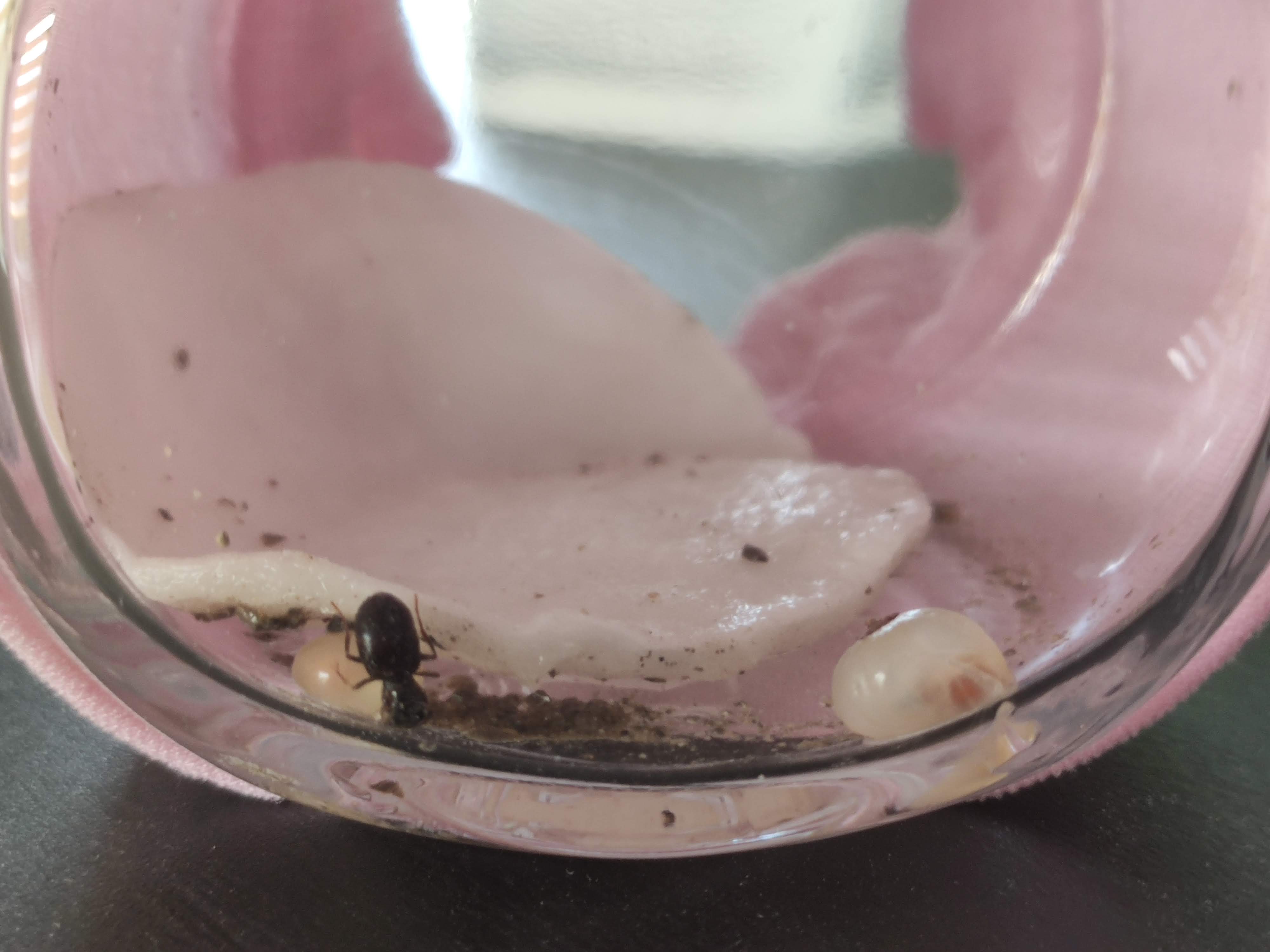 Bei meiner Suche konnte ich noch keine Eier finden. Darum war ich am überlegen, sie nachträglich umzusiedeln. Dies würde die konstante Feuchtigkeitszufuhr erleichtern. Da sie sich allerdings schon 3 Tage in diesem Nest häuslich eingerichtet hat, vermute ich, dass dies keine so gute Idee sein wird und versuche manuell die Watte feucht zu halten. Wie ich vermute, ist dies aber ein kleiner Drahtseilakt. Ist es zu trocken tut das sowohl Gyne als auch Eiern nicht gut, wird es zu feucht, droht sie zu ertrinken. Ich werde mein bestes versuchen und sowohl morgens als auch Abends mal nach der Feuchtigkeit tasten.