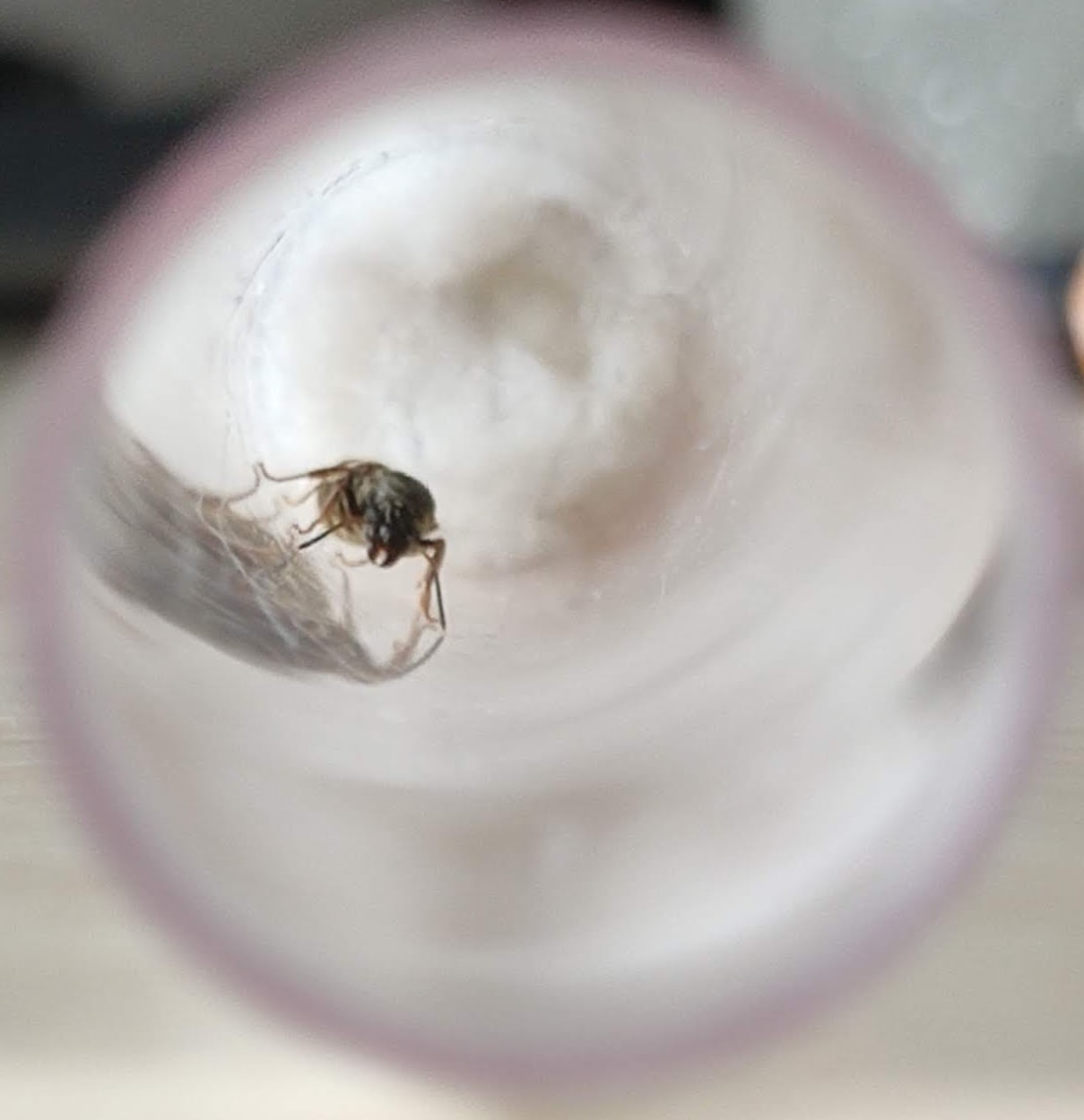 Derzeit bewohnt Irene ein kleines Glas. In diesem befindet sich ein Watte-Pad, das befeuchtet ist. Leider hat sie in diesem Haus keinen dauerhaften Wasserspeicher, der für eine gleichmäßige Feuchtigkeit sorgt. Stattdessen befeuchte ich die Watte selbst mit einer kleinen Pipette.