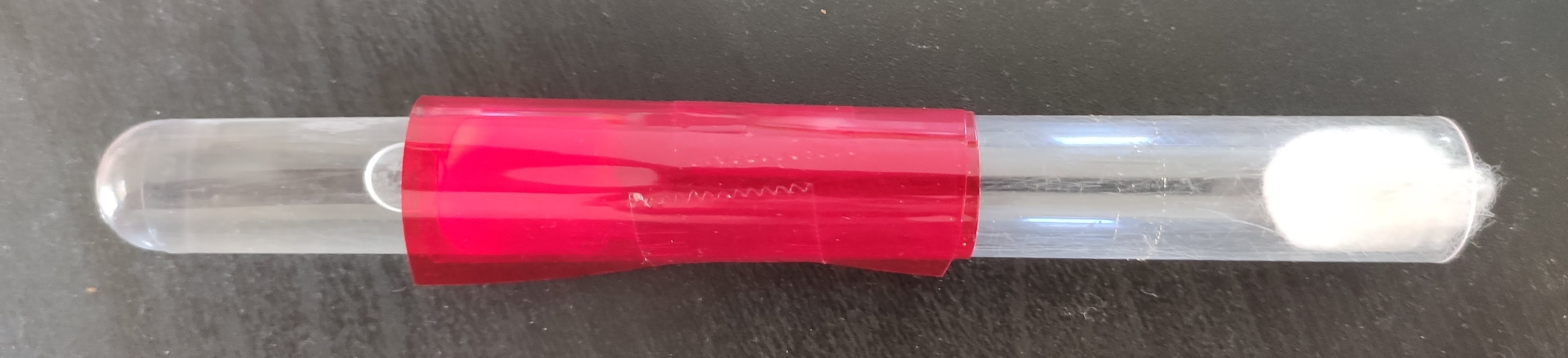 Wie bereits erzählt bewohnt Zenobia jetzt ein Reagenzglas. In diesem ist im hinteren Drittel ein Wasserspeicher, dafür habe ich ganz gewöhnliches Leitungswasser verwendet. Um das Wasser abzutrennen und trotzdem die Feuchtigkeit zur Gyne zu lassen, ist das Wasserdepot durch einen Wattepfropfen abgedichtet. Dieser saugt sich dauerhaft mit Wasser voll, und gibt es langsam in die andere Richtung ab. Im Hauptteil sitzt Zenobia selbst und wird am hinteren Ende hoffentlich bald ihre Eier ablegen. Dass sie nicht abhaut und trotzdem Luft bekommt, habe ich das Loch mit einem weiteren Wattepfropfen verschlossen. Als UV-Schutz hatte ich noch von letztem Jahr eine Rote Folie. Diese lässt mich zwar alles einigermaßen beobachten, hält aber trotzdem das böse UV-Licht ab, dass Zenobia sich völlig stressfrei auf die Brut konzentrieren kann.